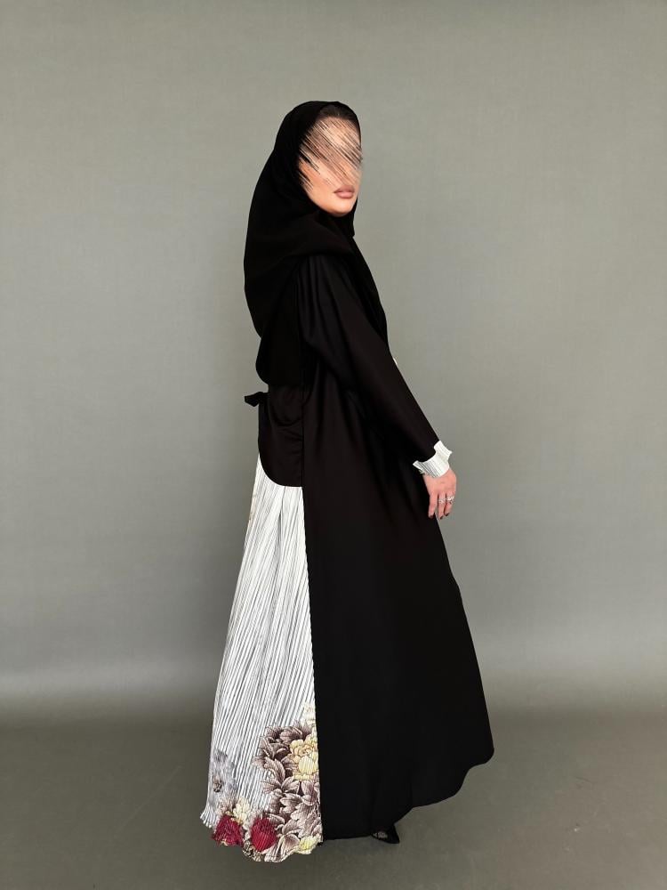 • الموديل: صُممت العباية بموديل نص كلوش، وهي قصة تجمع بين الأناقة والراحة. هذا الموديل يعطي العباية اتساعاً جميلاً وانسيابية ناعمة دون أن تكون مبالغاً فيها، مما يجعلها عملية وأنيقة في آن واحد.