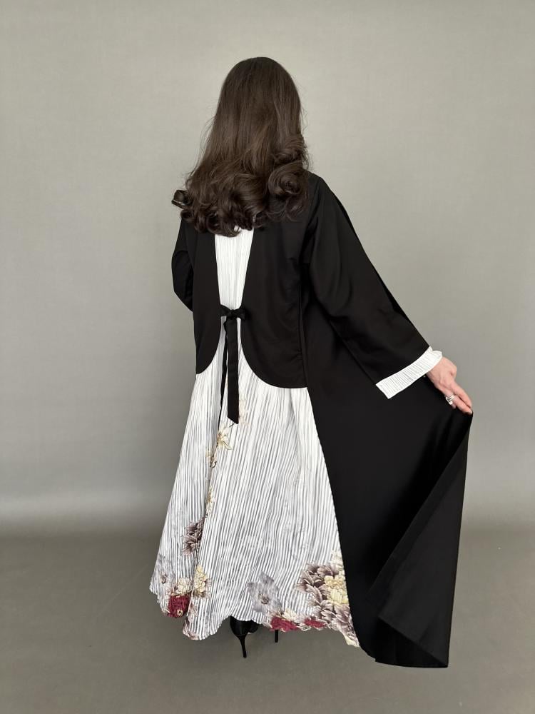 • التطريز والتفاصيل: تتميز العباية بـتطريز يدوي على طول العباية من الأمام والأكمام، مُرصع بالكريستال اللامع. هذا التطريز المتقن يضفي لمسة من البهاء والفخامة، ويعكس الضوء بشكل جميل، مما يجعل العباية تتألق مع كل حركة. الكريستال يضيف لمسة من البريق والسحر، مما يجعلها مثالية للمناسبات التي تتطلب إطلالة فاخرة.